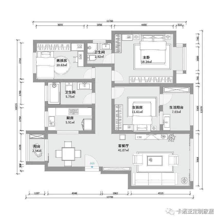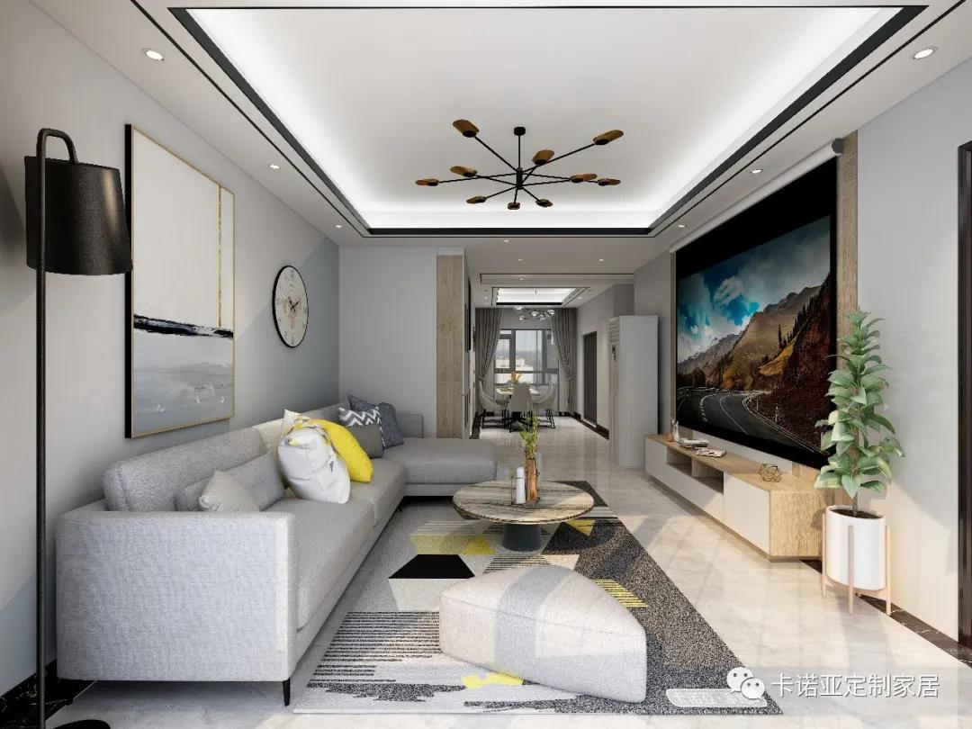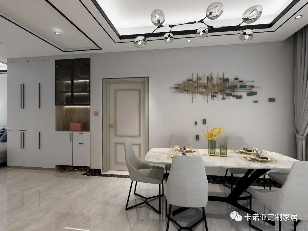 客餐廳一體化,以鞋柜為界,將整個空間劃分成兩個區域,既協調又統一。
