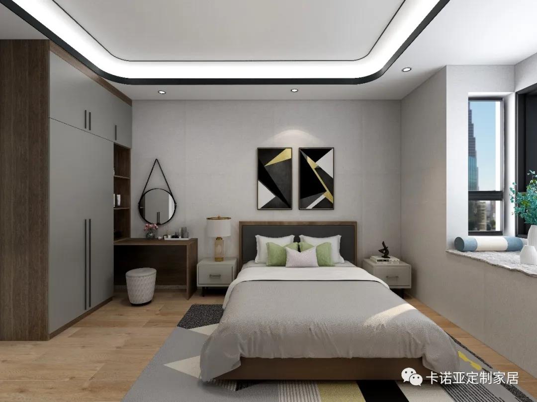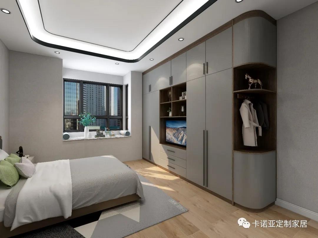 主臥帶有雙衣柜,收納功能強大,靠近床頭的衣柜兼具梳妝、閱讀等功能,滿足女主人的愛美之心。轉角開放式圓弧設計,線條更加圓潤流暢,避免磕磕碰碰。