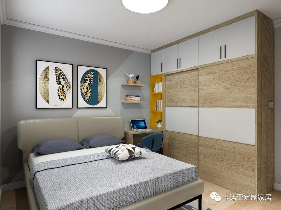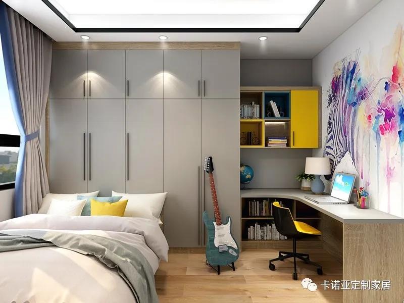 衣柜與書桌、書柜一體化,為孩子騰出更多自由活動的空間,既滿足了小孩的學習效率、收納需求,又讓原本狹長的兒童房更顯整齊、開闊、明亮。