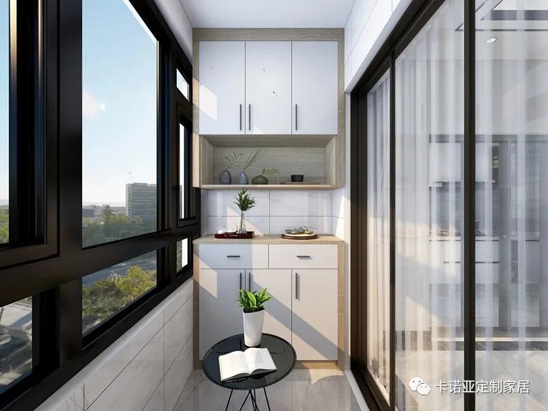 生活陽臺,同樣利用陽臺的戶型結構定制了一個三段式陽臺柜,減輕室內收納壓力。