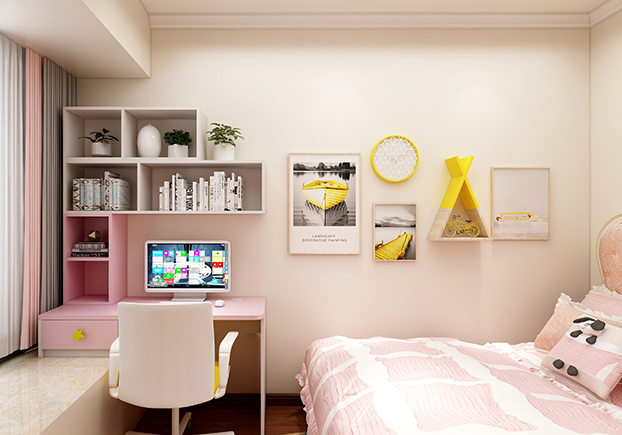 ▲小朋友的房間比較明亮,童趣十足,水天藍和公主粉的設計再搭配明亮黃,瞬間輕快明亮,功課區和休閑區的設計,書桌功課做完立馬可以在休閑區玩耍,一房多用,小朋友們表示很喜歡自己的房間。