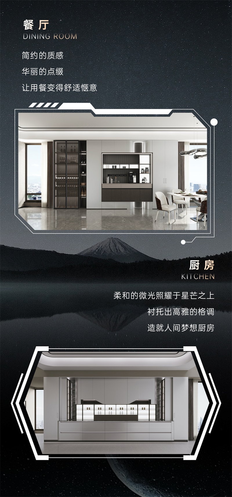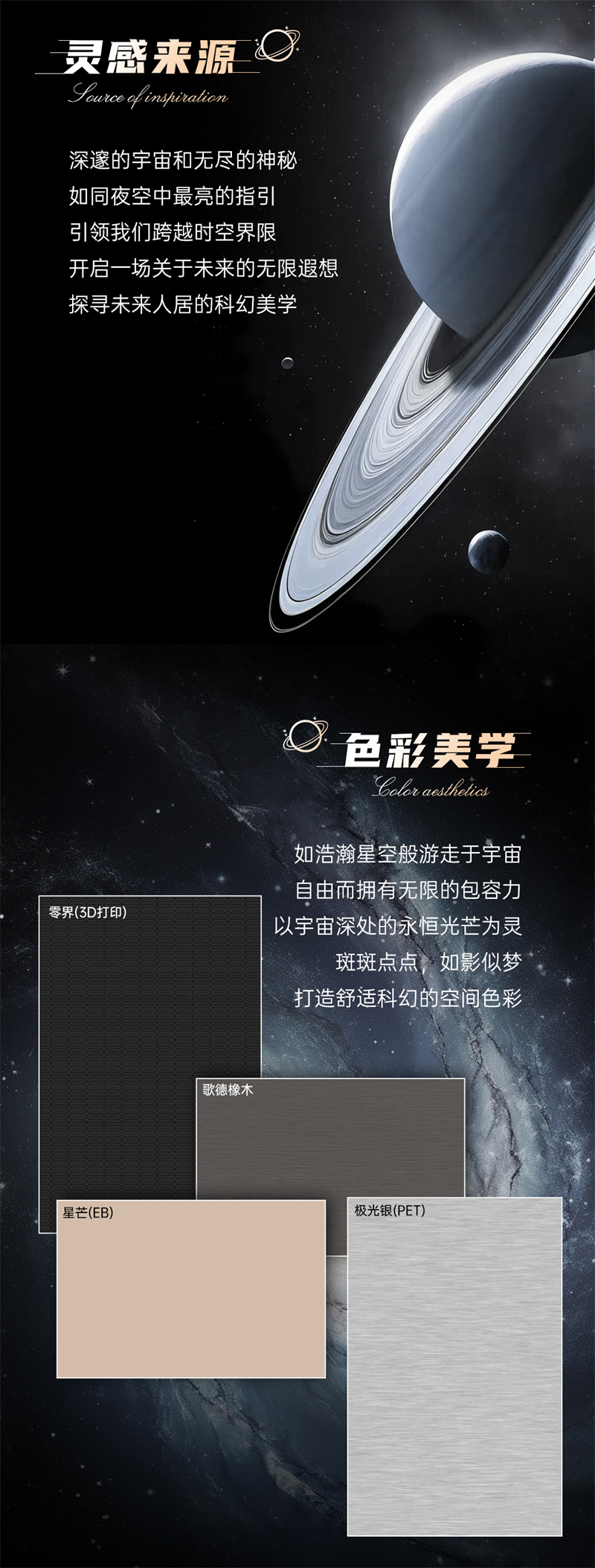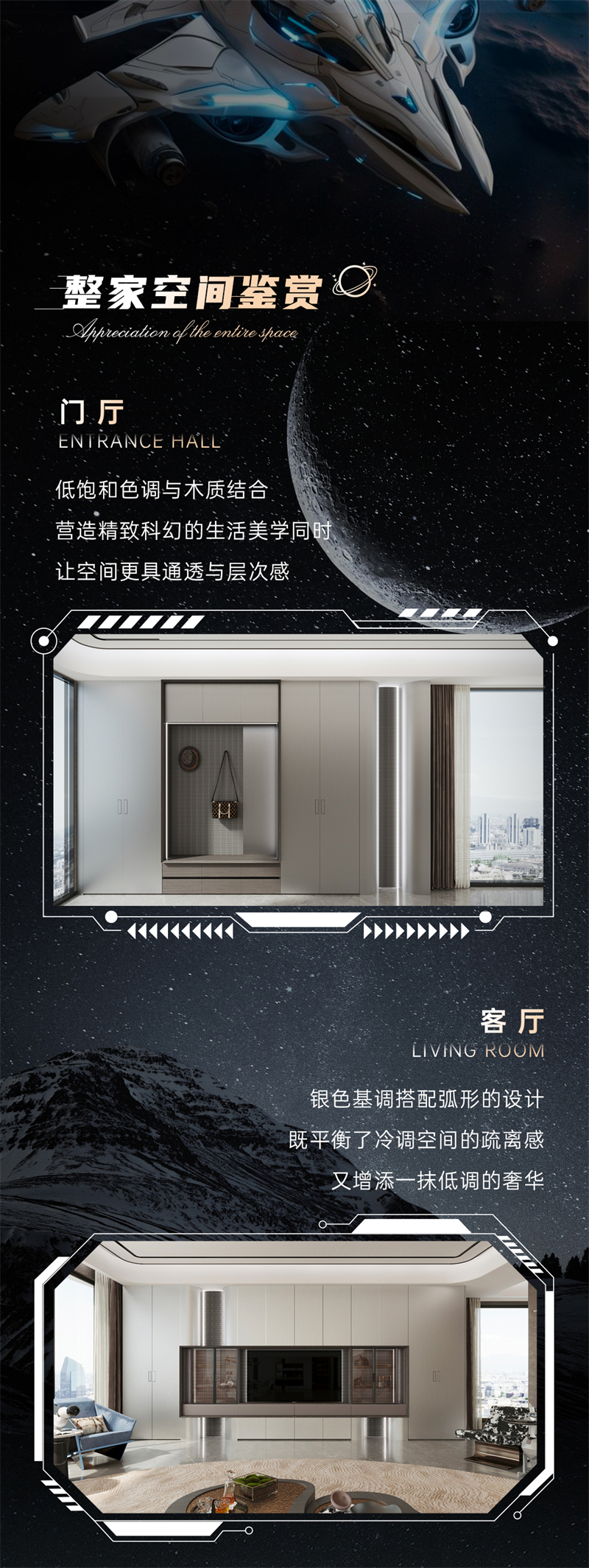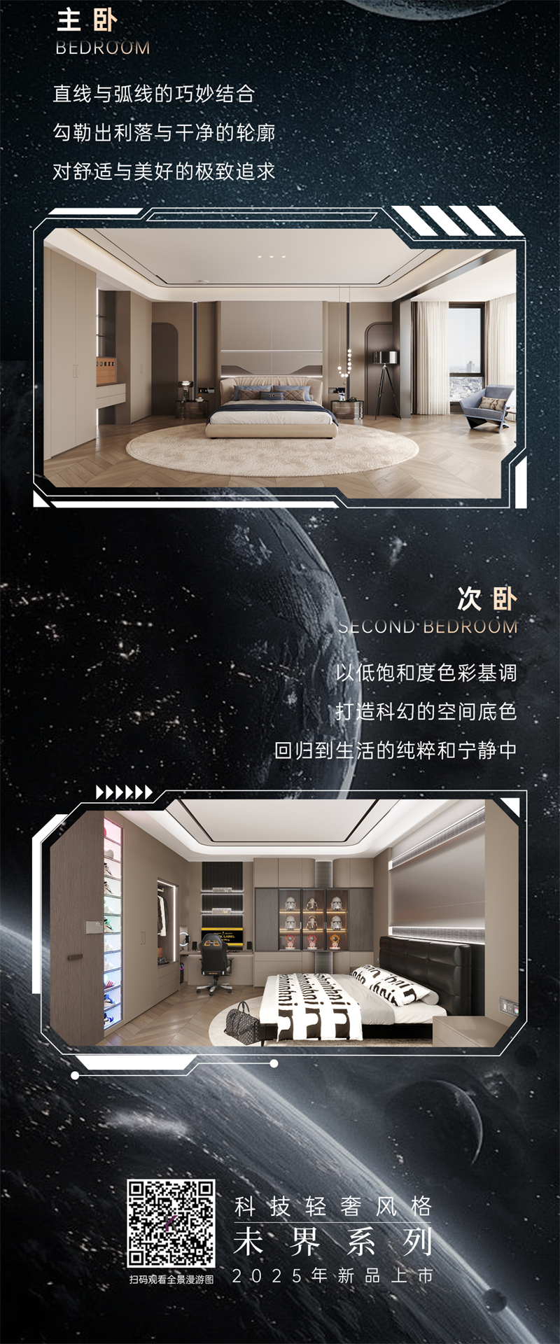 2025年新品系列,未界系列 |科技輕奢風(fēng)格以科技青年(航天設(shè)計(jì)師、汽車(chē)工程師、科技創(chuàng)業(yè)者等)職業(yè)特性為核心,融入航天元素與汽車(chē)模型展示,借助流暢線條、科技燈光,搭配智能家居,營(yíng)造未來(lái)感氛圍,滿足對(duì)科幻的遐想,實(shí)現(xiàn)科技與生活的融合,展現(xiàn)探索精神。