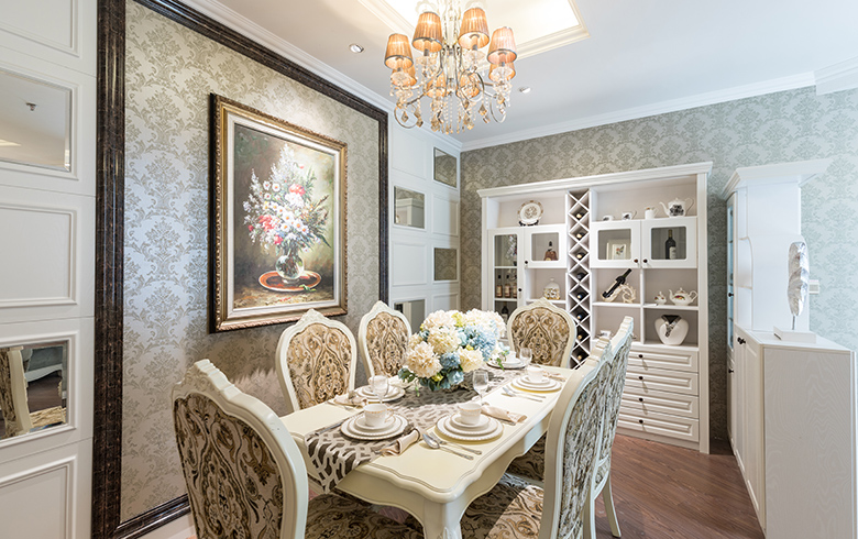 餐廳充盈著白色的純粹,如初戀般純凈與美好,橡木錯落有致的紋理,帶來別樣精致的質感。家具中流暢線條的寫意設計,看似隨意刻畫的簡歐風情卻表達得恰到好處。