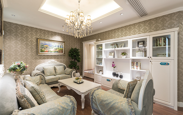 純色的家具、大氣婉約的吸塑造型,配以素雅的軟裝和歐式經典紋飾的沙發及茶幾,點綴帶有抽象印花圖案的抱枕,營造浪漫、靜雅的家居空間。