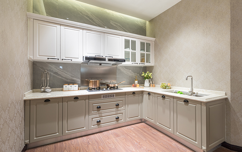 廚柜采用白色和淺灰色為主要配色,烘托空間的優雅氣質。歐式淺色印花墻紙,與廚柜門板既相互融合,又能體現出層次間的落差美。