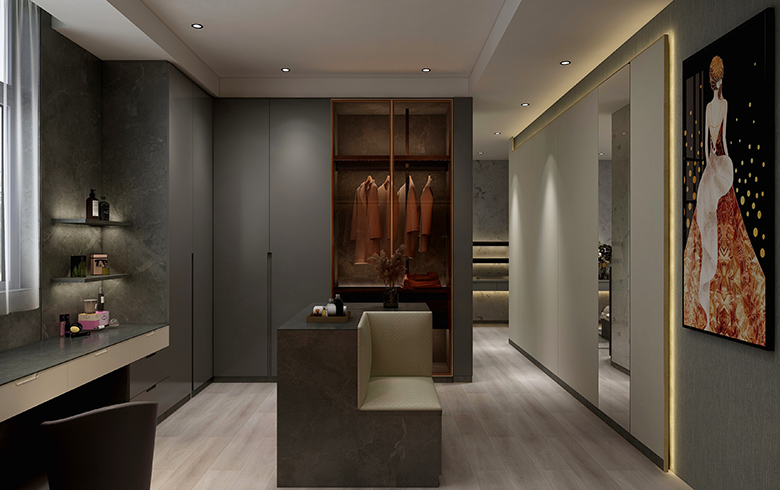 “雅皮士”與“黑金剛”撞色,藝術(shù)油畫(huà)點(diǎn)睛,打破灰白色系的高冷,打造富有人文氣質(zhì)的衣帽間。