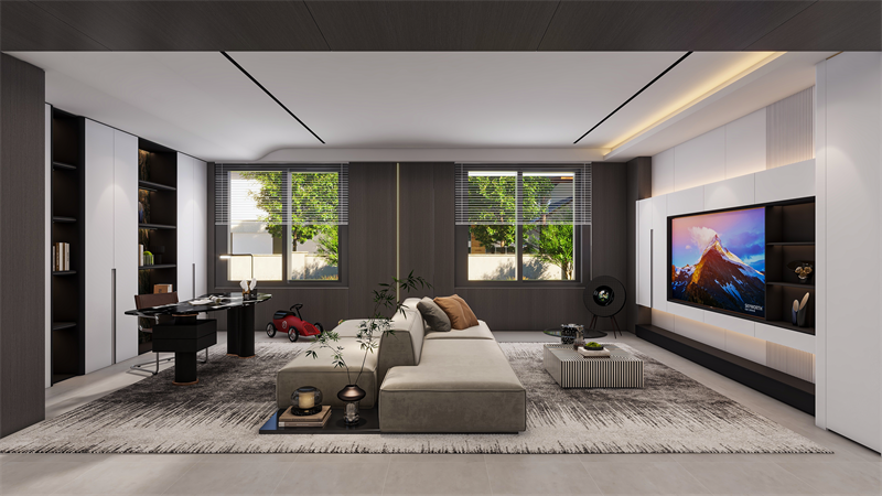 電視背景墻采用簡潔流暢的線條,與簡約的“晨露白”色彩完美融合,弧形轉(zhuǎn)角過渡,展現(xiàn)一種簡約而不失精致的柔美感。電視柜采用高端定制精湛工藝,包括黑科技的懸浮設(shè)計+柜中柜設(shè)計+拉米諾/無孔工藝,打破傳統(tǒng)墻面的厚重感,賦予空間輕盈靈動的觀感。