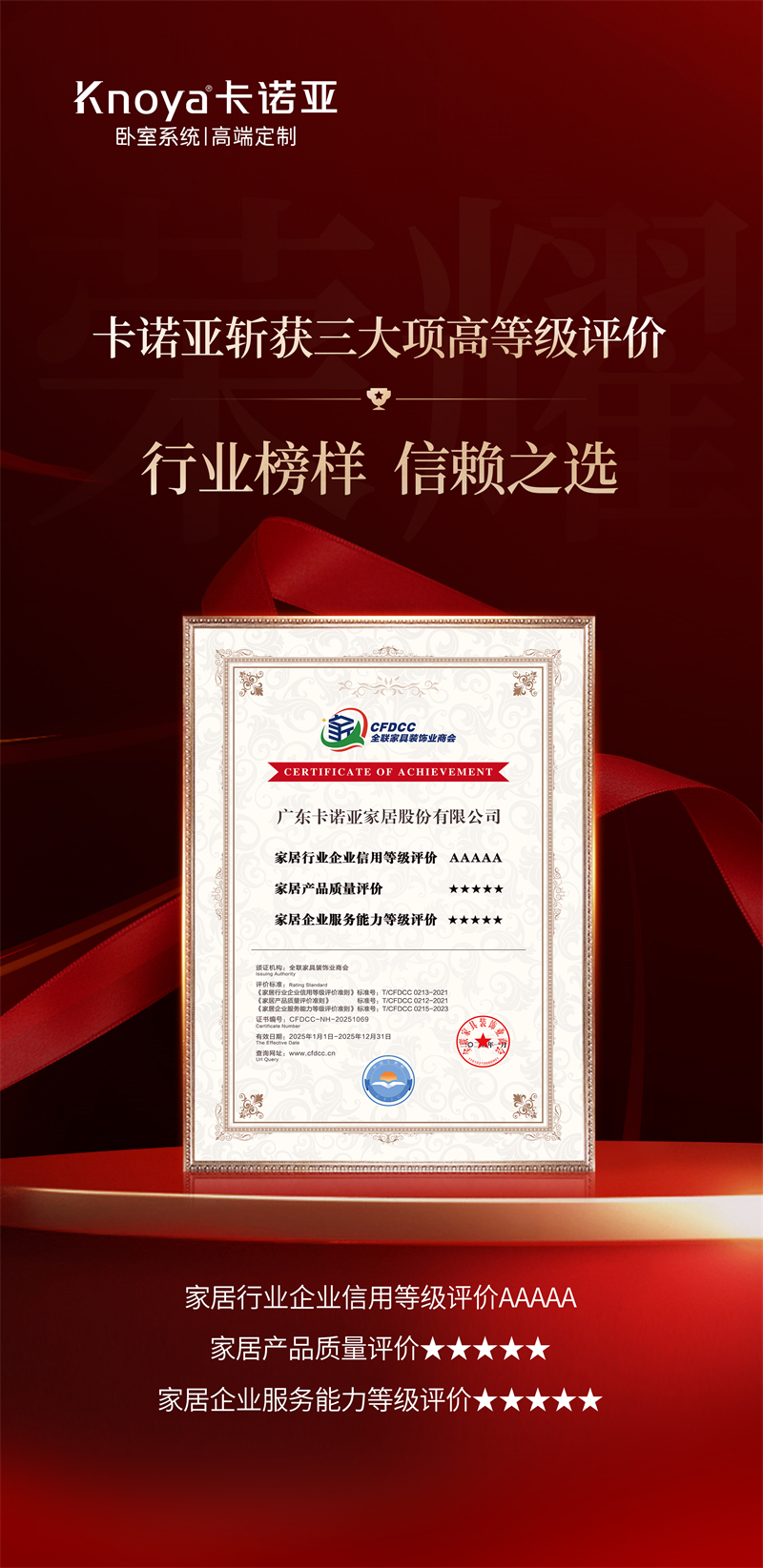 此次卡諾亞獲得3項高等級認證,不僅是對其24年以來堅守品質、誠信經營、用心服務的高度認可,更是對其未來堅守初心、向上而行的激勵與鞭策。未來,卡諾亞將堅守“發展以人為本,品質源于細節,服務創造價值”的經營理念,通過“臥室系統”和“整家定制”兩大品類的不斷深耕,為客戶提供更高品質、更高水準的一站式、個性化全案尊享服務。
